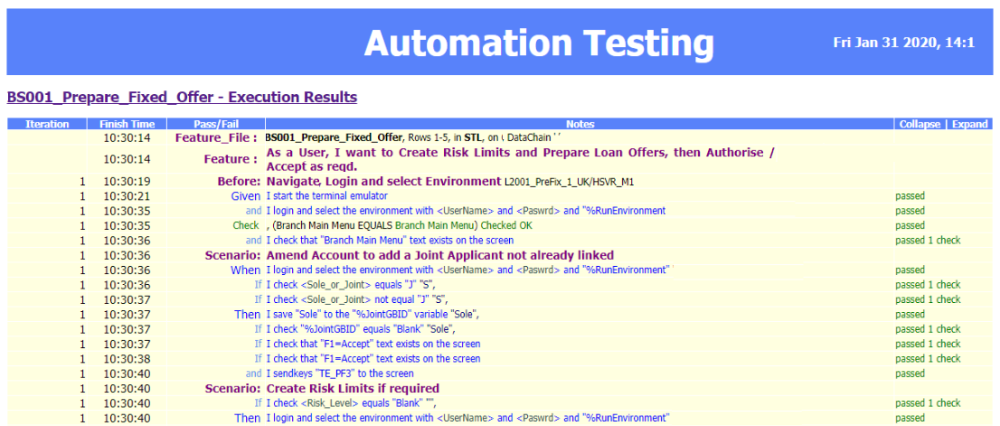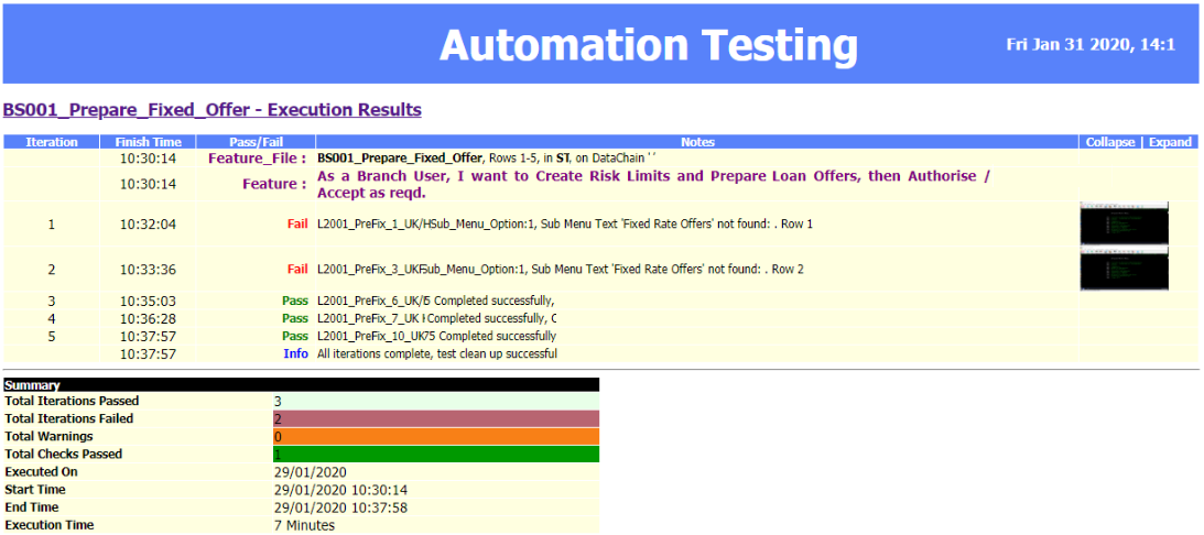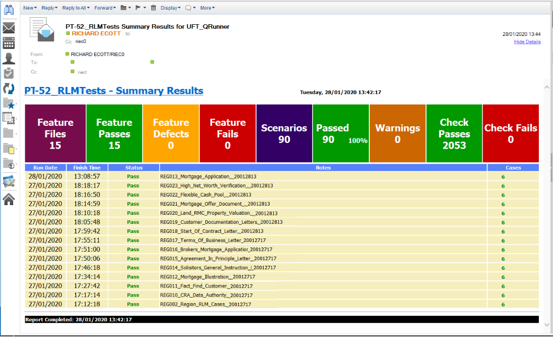 The reports are real-time so you can see the current state of the test mid-run. The counts of steps, the Passed checks and Failed checks are also shown. If you run several features together then 'Feature Pack' reports are built and stored for audit purposes. Copies of the reports can also be emailed via Outlook or Lotus Notes to a list of recipients.