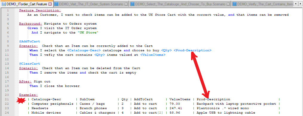 As we can split Features into several Scenarios, we can also have several Examples for a single scenario. This is achieved by providing a <Name> for each piece of example data in a table format separated by |